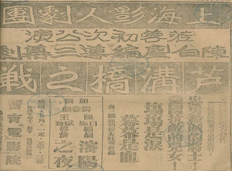上海影人劇團(tuán)《盧溝橋之戰(zhàn)》廣告 圖據(jù)新明電影院成都電影輕博物館